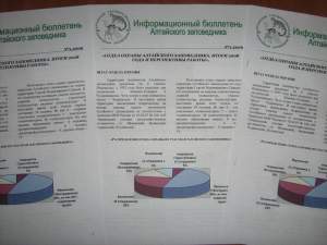 В Алтайском заповеднике вышел в свет первый номер «Информационного бюллетеня Алтайского заповедника», предназначенного для коллектива заповедника. В каждом его выпуске (с периодичностью раз в квартал) будет более подробно освещена и проанализирована работа отделов Алтайского заповедника.