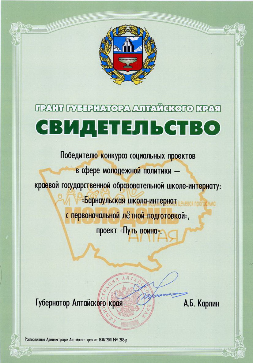 23-го августа 2011 года Управление Алтайского края по образованию и делам молодёжи подвело итоги первого этапа конкурса социальных проектов на предоставление грантов Губернатора Алтайского края в сфере молодёжной политики в 2011 году. Среди победителей – Барнаульская школа-интернат с первоначальной лётной подготовкой с проектом «Путь Воина», разработанного совместно с сотрудниками Алтайского биосферного заповедника в рамках Телецкой школы молодёжного экологического туризма.