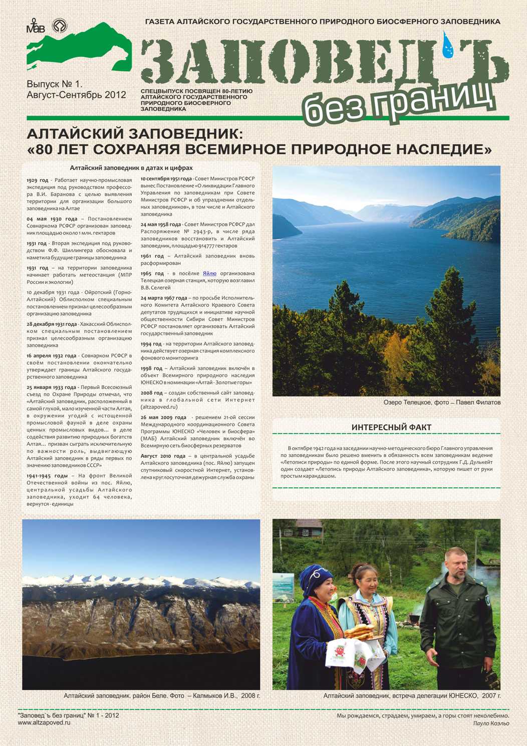 Алтайским заповедником издан очередной выпуск собственной газеты «Заповедь без границ». Седьмой по счёту номер (газета издаётся с марта 2008 года) является спецвыпуском, так как посвящён многим юбилейным мероприятиям и включает дополнительные страницы - спецвкладыши.