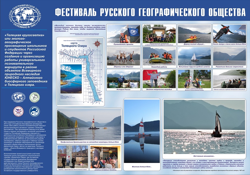 В рамках Фестиваля прошла конференция «География, общество, окружающая среда» по итогам грантовой деятельности Русского географического общества в период 2012\2013 годов. На конференции был представлен доклад Алтайского биосферного заповедника о ходе работ по проекту