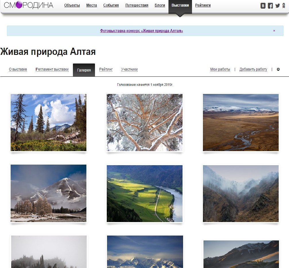 «Живая природа Алтая» и организует в рамках проекта фотоконкурс-выставку в интернете. Участники смогут не только публиковать свои фотографии природы Алтая, но также привязать их к месту съемки на интерактивной карте России и снабдить каждую фотографию авторским описанием, которое при желании автора может быть развернуто до размера мини-эссе (до 1500 знаков). Фотографы, чьи работы наберут больше всего положительных оценок от зарегистрированных пользователей Смородины, получат ценные призы. Кроме того, специальный приз достанется тому участнику конкурса, чью работу особо отметят основатели портала Смородина.