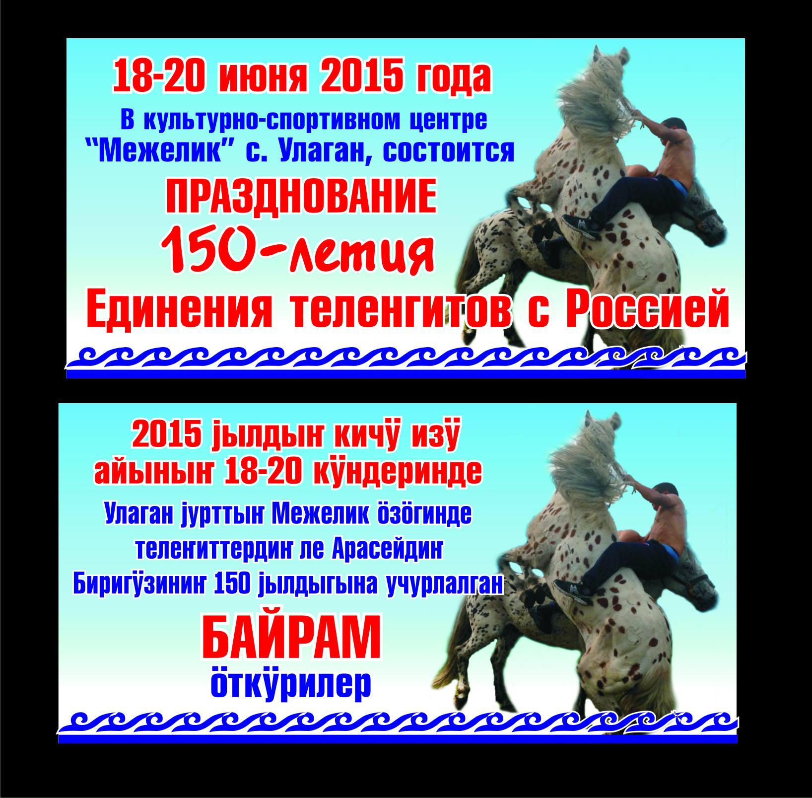 Новости наших друзей и коллег: В Улаганском районе пройдёт празднование 150-летия единения теленгитского народа с Российским государством С 18 по 20 июня 2015 года в с. Улаган Улаганского района Республики Алтай, в культурно-спортивном центре «Межелик», состоится празднование 150-летия со дня единения теленгитского народа с Российским государством. Праздник пройдет на республиканском уровне. Ожидается приезд делегаций из Монголии, Казахстана, республик Тыва, Хакасия, Новосибирской и Кемеровской областей и районов республики. Параллельно здесь будет проходить Международный курултай сказителей, посвященный 90-летию со дня рождения выдающегося алтайского кайчы XX века А.Г. Калкина.