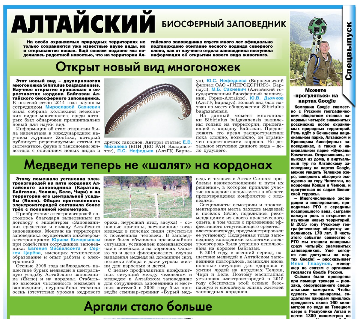 Об Алтайском биосферном заповеднике в очередном выпуске газеты Природа Алтая
