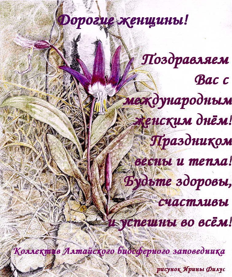 Поздравляем с 8 марта! Дорогие девочки, девушки и женщины! Алтайский биосферный заповедник поздравляет с замечательным праздником весны. Будьте всегда милы, нежны и прекрасны как первые весенние цветы, дарите радость друг другу и всем окружающим. Специально к празднику - наш фотоальбом о прекрасных женщинах - сотрудницах Алтайского биосферного заповедника.
