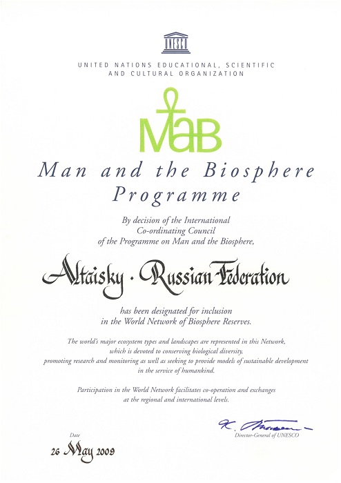 26 мая 2009 года Алтайскому государственному природному заповеднику был присвоен статус биосферного.