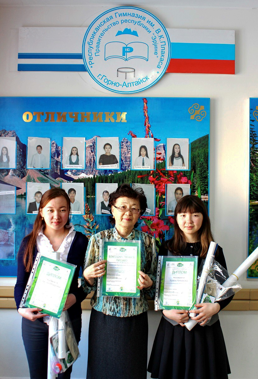 Республиканской гимназии им. В.К. Плакаса награды как победителям конкурса научно-исследовательских работ (регионального этапа), проведённого в рамках VI Открытого межрегионального экологического фестиваля «Древо Жизни».