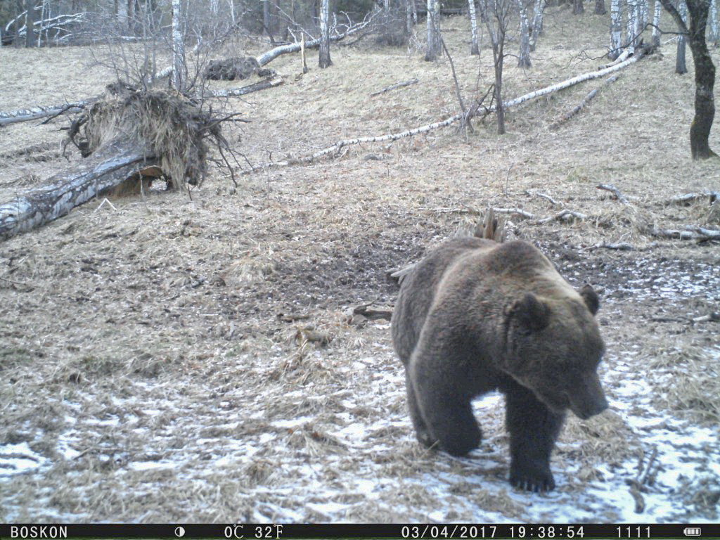 Получены первые кадры проснувшихся в Алтайском заповеднике медведей. Только что научный сотрудник Алтайского заповедника Юрий Калинкин прислал кадры с фотоловушки, которая зафиксировала проснувшихся на заповедной территории медведей. Первый бурый медведь попал в кадр фоторегистратора на территории Алтайского заповедника в 2017 году 3 апреля. Другой медведь прошёл мимо камеры фоторегистратора уже 7 апреля. Второго медведя камера фотоловушки заинтересовала и он даже оставил на память фотографию своего когтя.