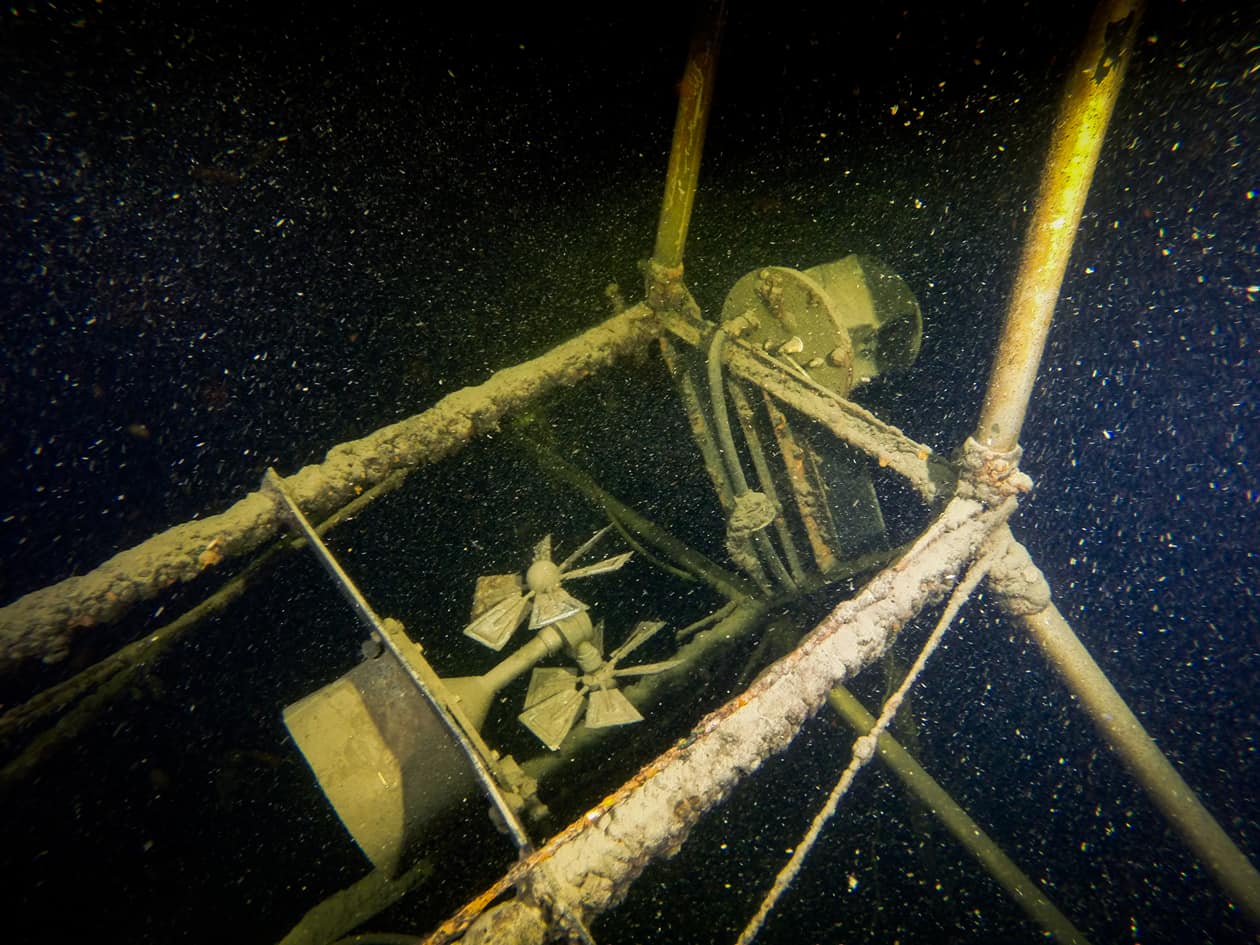 По отсутствию каких-либо следов на склоне можно предположить, что погрузилась вертикально вниз, а не сползала по свалу. Состоит из округлого основания диаметром около 3-х метров, каркасной фермы и трех лучей, отходящих от неё. На конструкции установлены приборы для метеонаблюдений (анемометры измеряли скорость и возможно направление ветра), кабели, виден керамический изолятор - питание подавалось с берега. Оборудование в идеальной сохраности, нетронуто и не разграблено. Крыльчатки анемометров до сих пор вращаются при лёгком прикосновении. Видны следы воздействия давления воды на короб прибора.