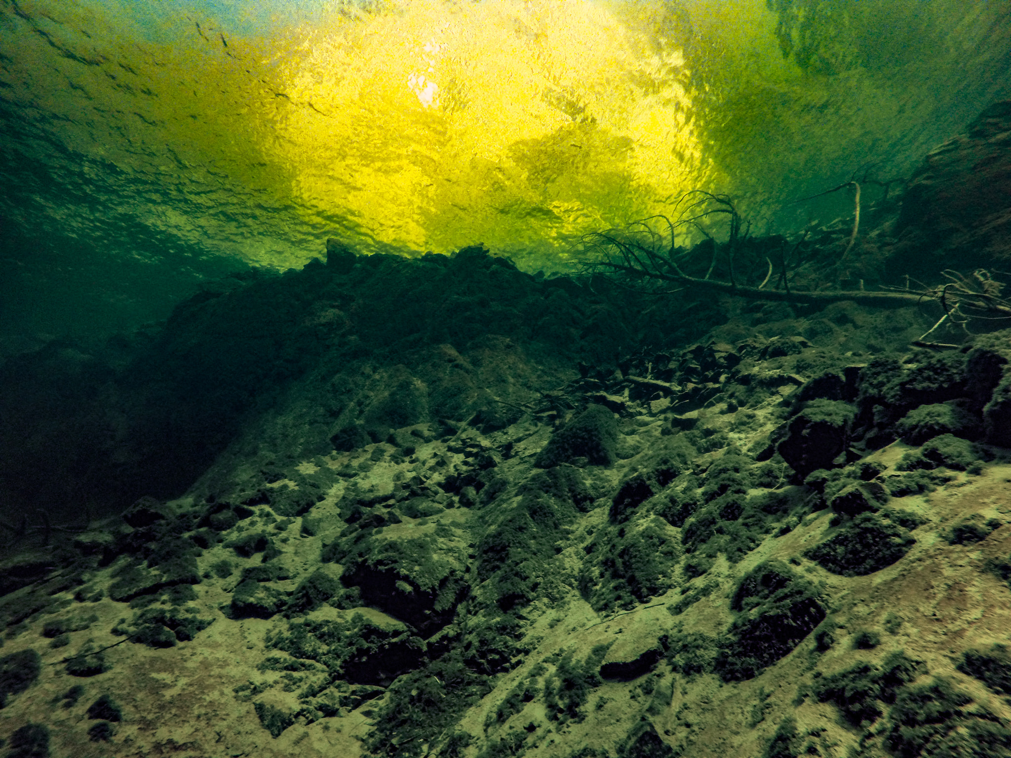 Со стороны залива и с южной части озера есть небольшой мелководный участок с каменистым дном глубиной около 3х метров, по которому можно плавать словно по лабиринту из больших обломков скалы.