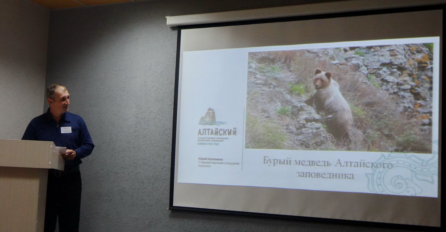 Юрий Николаевич Калинкин, старший научный сотрудник Алтайского заповедника, представил доклад об изучении бурого медведя в Алтайском заповеднике. Бурый медведь - фоновый вид Алтайского заповедника. По данным учётов на охраняемой территории обитает около 400 особей. Помимо прочего, важной проблемой является выход медведей в неурожайные годы к населённым пунктам. "Каждый инцидент выхода медведя к населённым пунктам в разных регионах страны, требует отдельного решения в зависимости от сложившейся ситуации", - считает Юрий Калинкин. По мнению Ю. Калинкина подобные семинары, где происходит обмен опытом между специалистами, помогают решать конфликтные ситуации, возникающие в разных регионах.