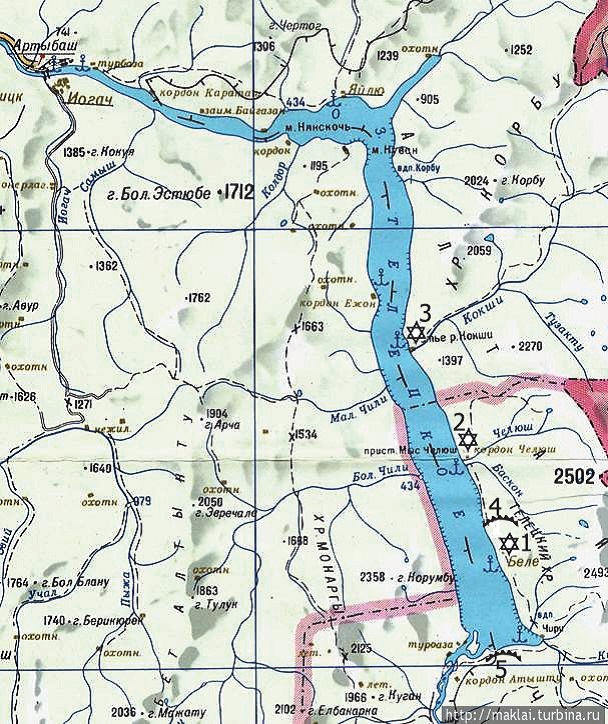 На фото: Археологические объекты Алтайского государственного заповедника. 1 – памятники окрестностей кордона Беле; 2 – памятники окрестностей кордона Челюш; 3 – местонахождение Кокши; 4 – каменное укрепление Артал; 5 – каменное укрепление Тоолок