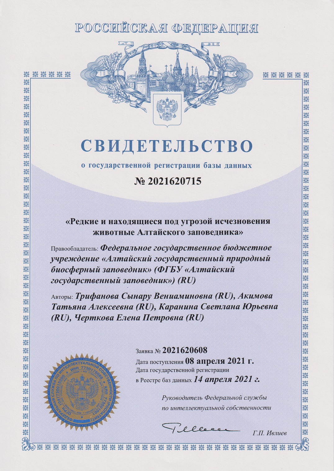 14 апреля 2021 года база данных «Редкие и находящиеся под угрозой исчезновения животные Алтайского заповедника» зарегистрирована в Федеральной службе по интеллектуальной собственности (Роспатент), после чего получено свидетельство о государственной регистрации № 2021620715. Авторы базы данных: Акимова Татьяна Алексеевна, Каранина Светлана Юрьевна, Трифанова Сынару Вениаминовна, Черткова Елена Петровна.