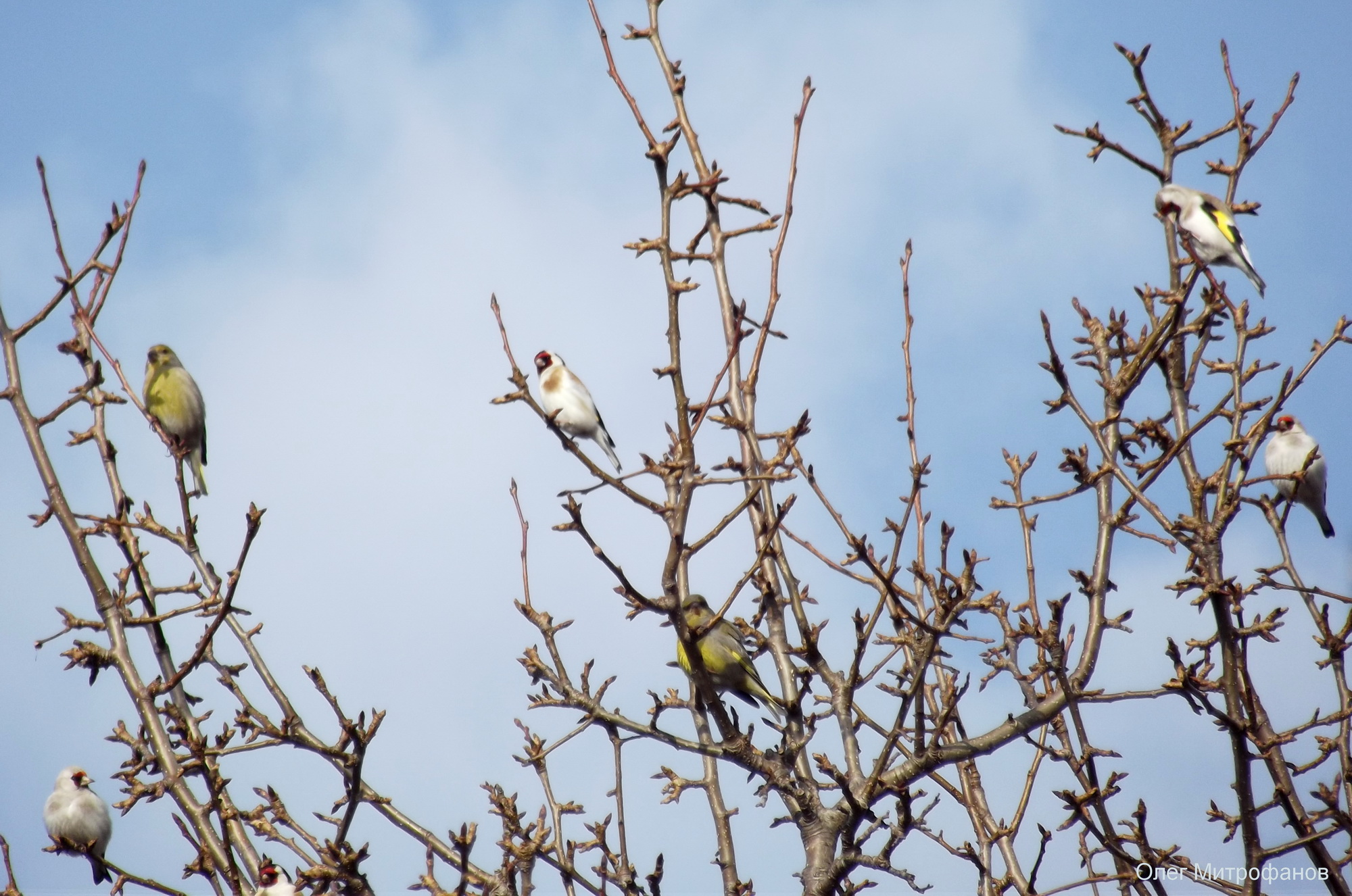 В стайке щеглов Carduelis carduelis были отмечены несколько чижей.