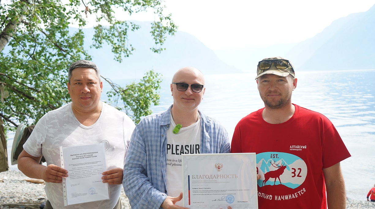 Председатель Совета Федерации благодарит Данила Ерофеева за многолетний добросовестный труд и большой вклад в развитие заповедного дела. Сенатор от Республики Алтай Владимир Владимирович Полетаев вручил Благодарность Данилу на берегу заповедного озера.