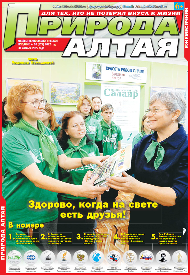 Материалы об Алтайском заповеднике публикуются практически в каждом выпуске главной экологической газете Сибири. В десятом номере читатели узнают о том, как прошла юбилейная XV Добровольческая экспедиция "По следам снежного барса", об очередной экспедиции сотрудников Алтайского заповедника по изучению лесного подвида северного оленя и о том какие звери попадают в объектив фотоловушек в местах обитания северного оленя. Андрей Немцов и Евгений Веселовский в заметке "Кедровая роща для заповедной деревни Яйлю или Никто не забыт и ничто не забыто" рассказывают о необычном подарке к 90-летию Алтайского заповедника от учащихся Барнаульской классической школы. Помимо этого читатели узнают как прошёл этап экологической экспедиции "Начни с дома своего" в Республике Алтай, где прошла встреча друзей и единомышленников в формате круглого стола. Читать фрагмент выпуска..
