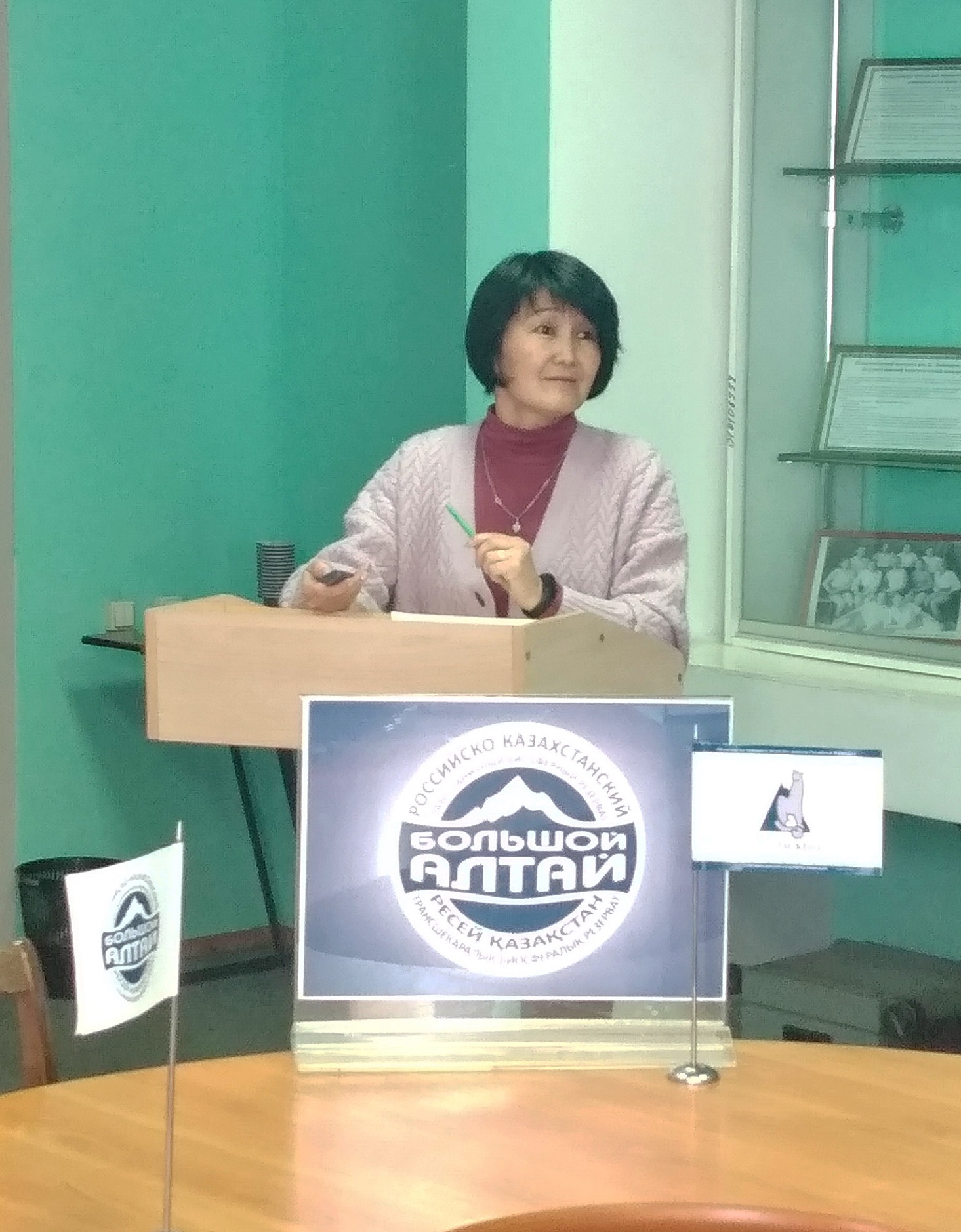 От Алтайского заповедника с докладом на тему «Полевые работы на критической территории «Богояш» Алтайского государственного заповедника» выступила заместитель директора по историко-культурному наследию, ведущий научный сотрудник, к.и.н. Трифанова Сынару.