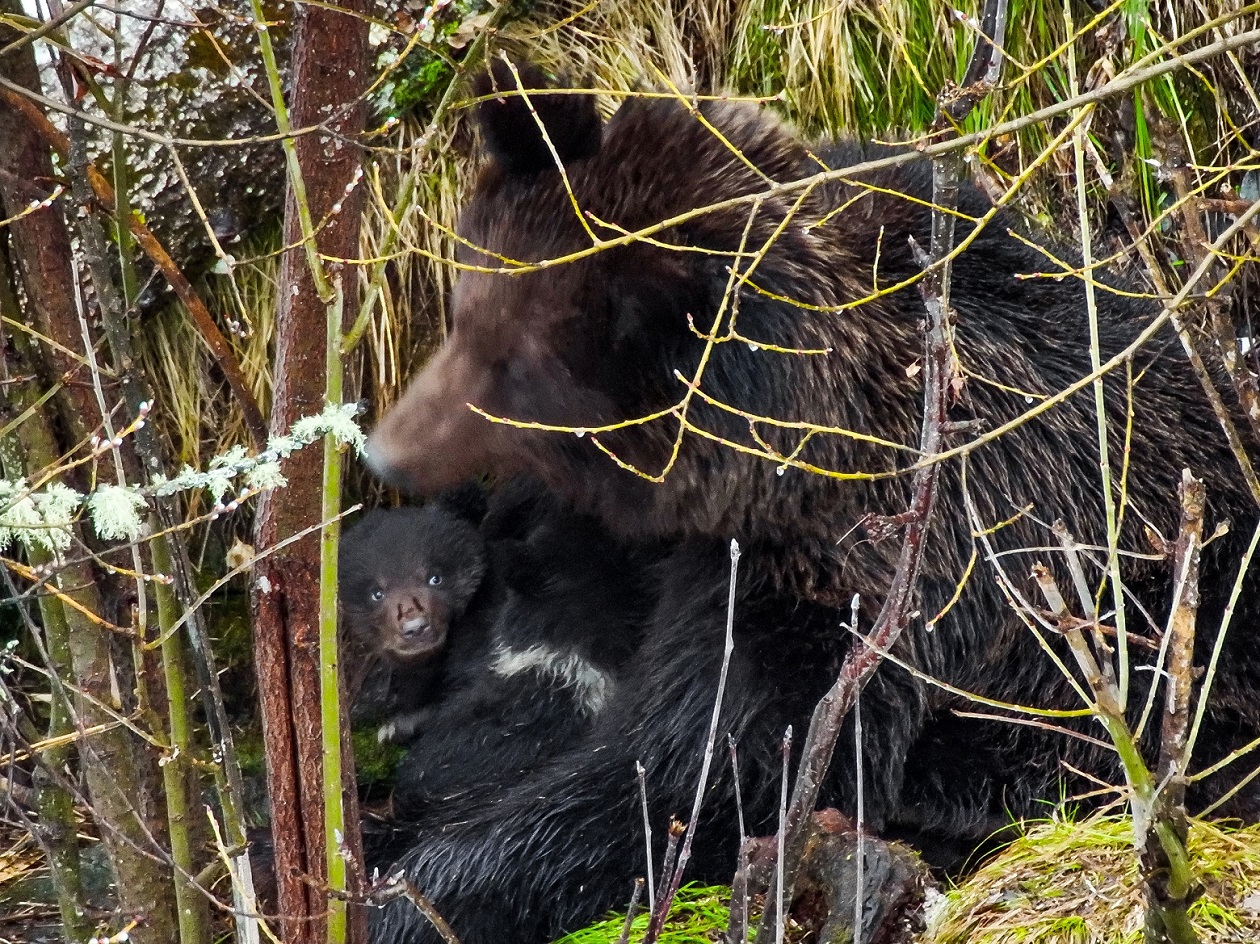 Малышей двое, один из них отличается белым воротничком, оба малыша выглядят активными и здоровыми. Недавно, недалеко от этого места был замечен ещё один молодой медведь.