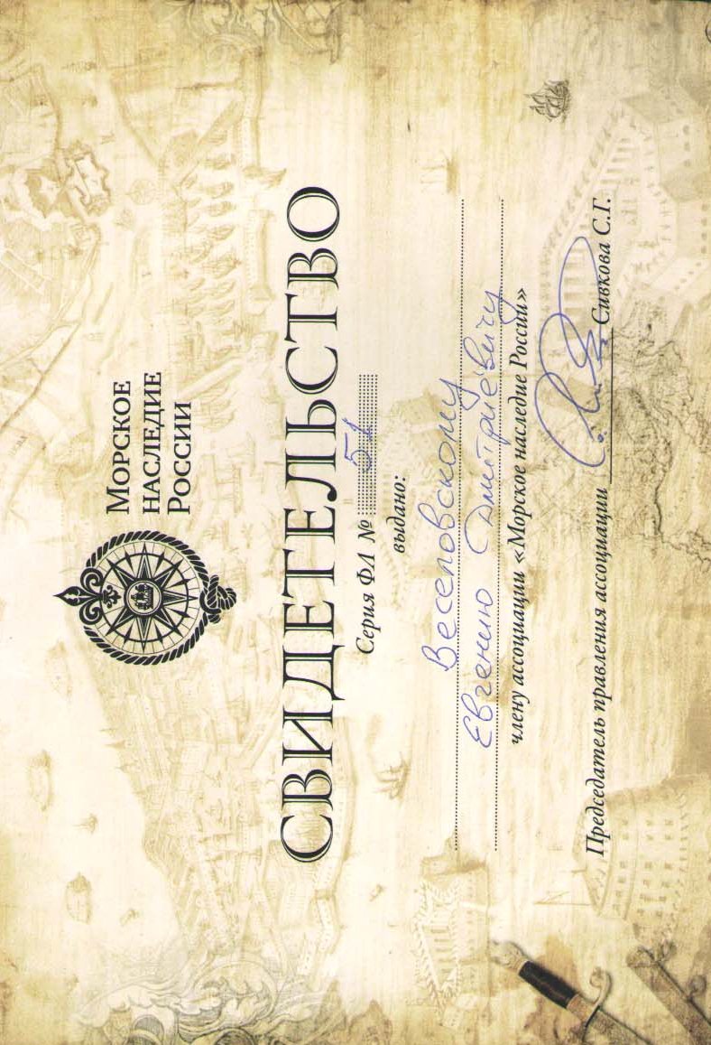 сертификат члена ассоциации «Морское наследие России», за настойчивость в поиске неизвестных страниц парохода «Шеф».