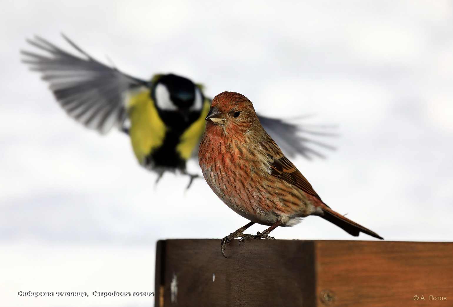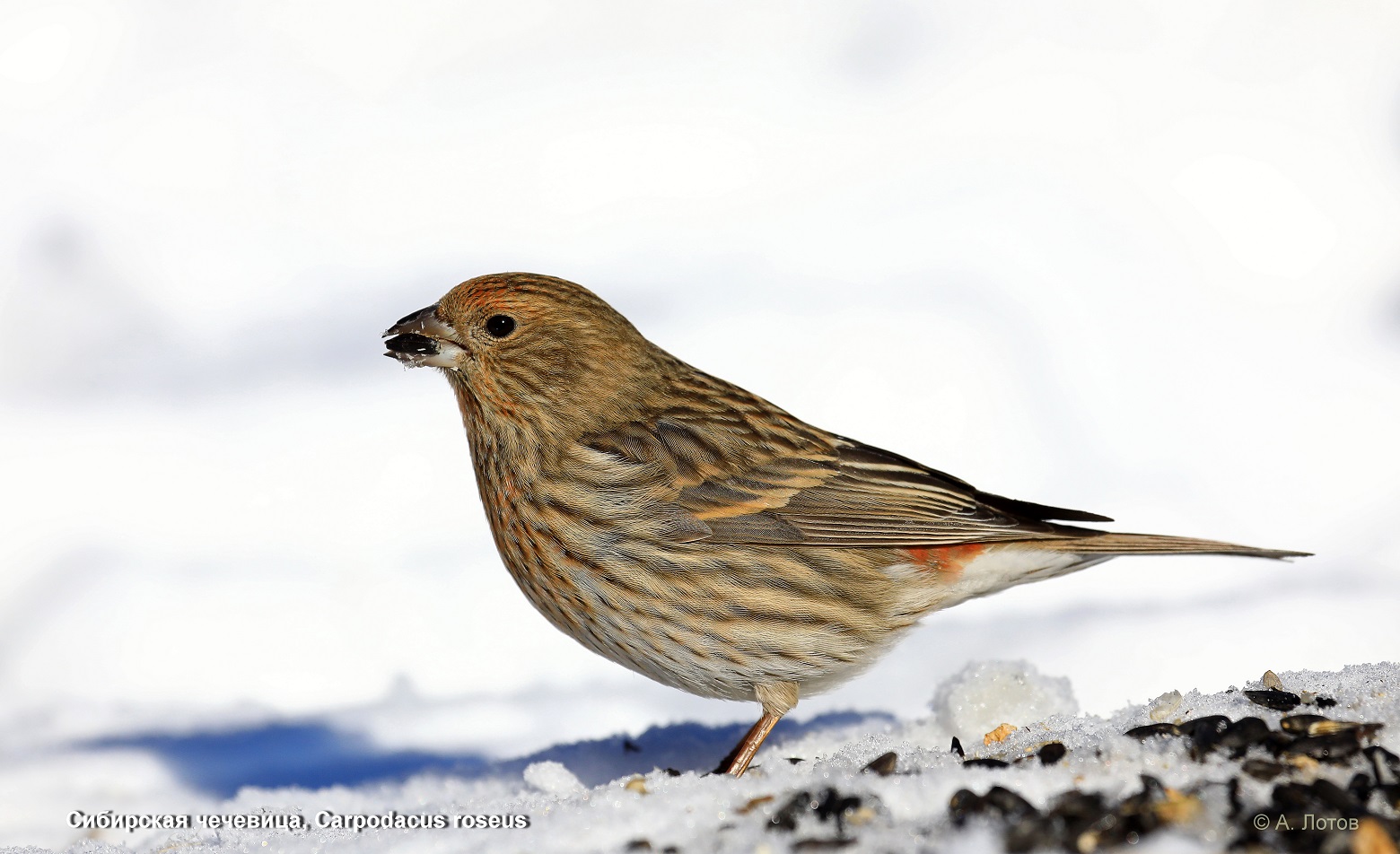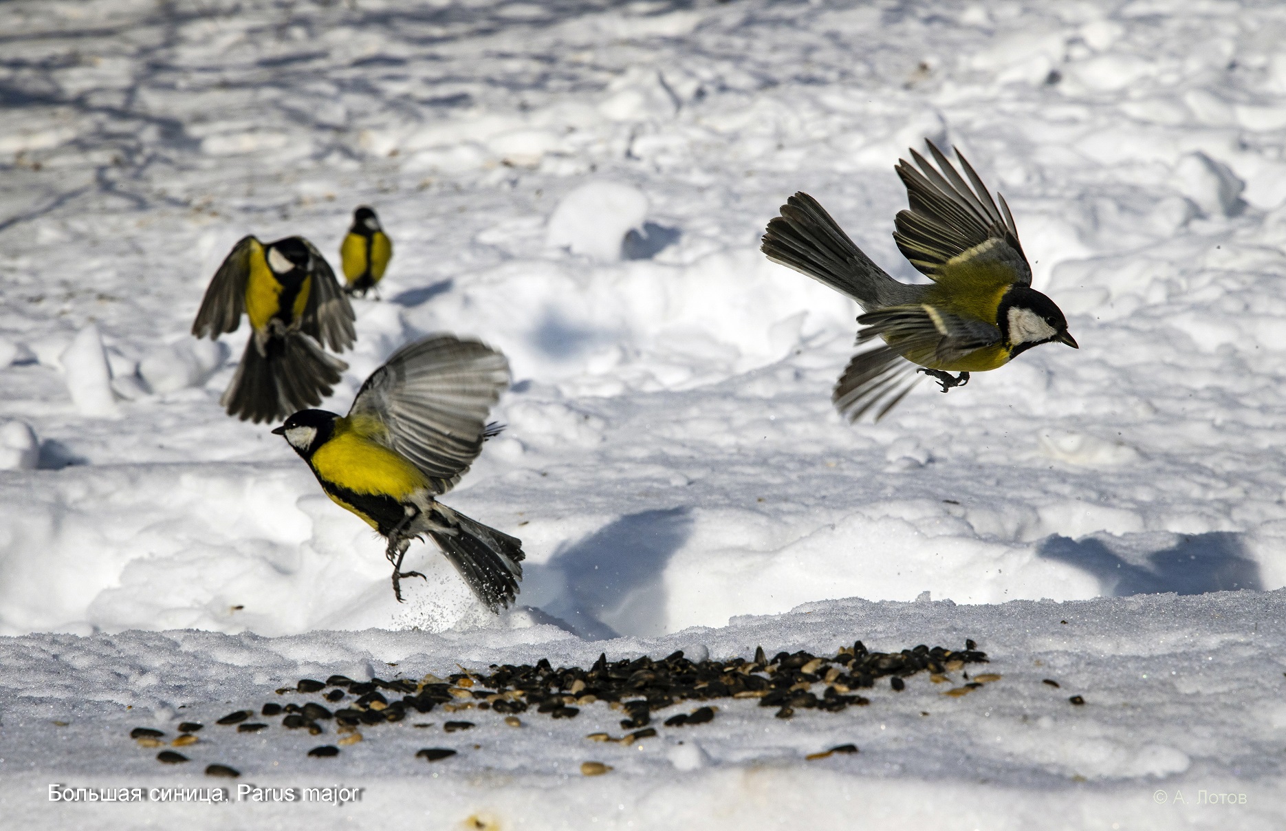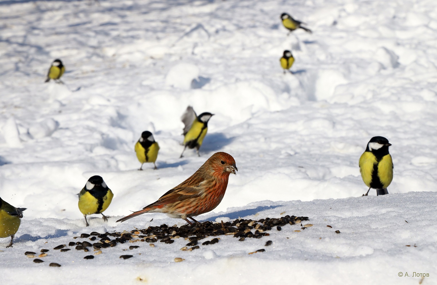 Фотографу удалось запечатлеть поползней, синиц, самку сибирской чечевицы, юрка, обыкновенных чечёток, снегирей, воробьев и др. птиц.