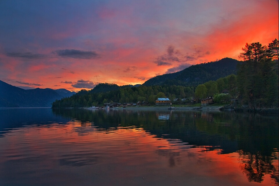 • Алтайский заповедник. Закат в Беле. Справа Алтынту, слева Туалок и, прямо устье Чулышмана. 2009 г.