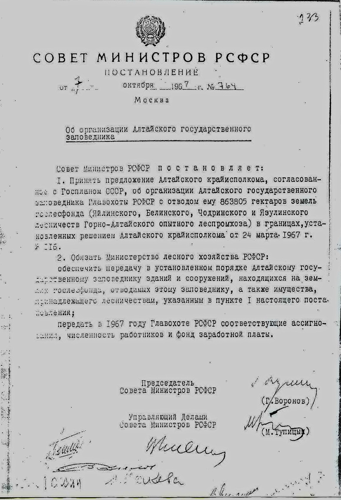 В 1967 г. 24 марта Исполнительный Комитет Алтайского Краевого Совета депутатов трудящихся выносит решение об организации Алтайского заповедника, в котором говорится, что в целях сохранения уникального природного комплекса Телецкого озера и Прителецкой тайги, а также учитывая ходатайства краевого общества охраны природы и Главного управления охотничьего хозяйства и заповедников при Совете Министров РСФСР Исполнительный Комитет краевого Совета депутатов трудящихся решил организовать Алтайский государственный заповедник и просить Совет Министров РСФСР решить вопрос об организации Алтайского государственного заповедника. В этом же году Совет Министров РСФСР постановляет организовать Алтайский государственный заповедник.