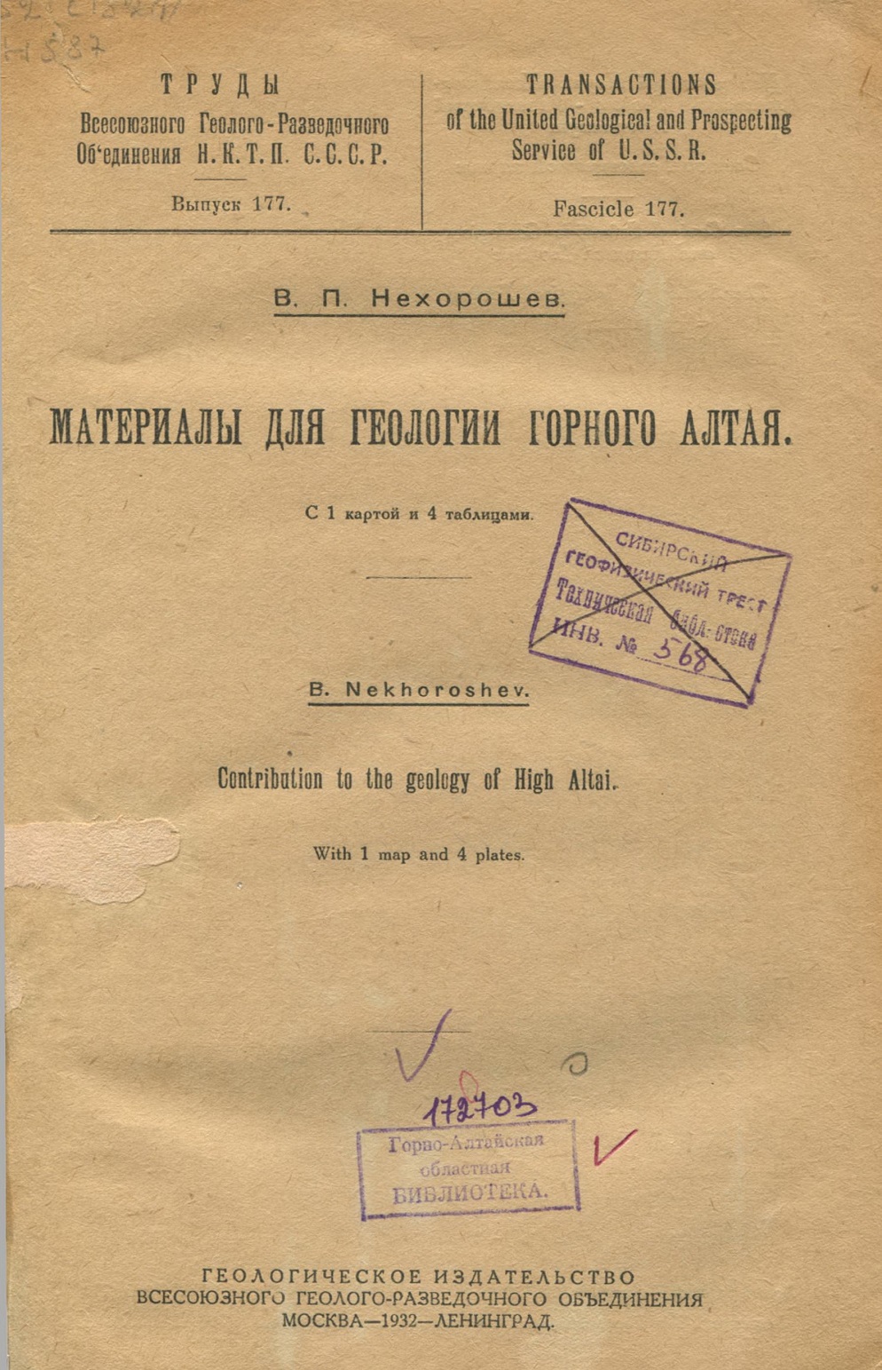 Нехорошев В.П. От Телецкого озера до озера Джюлю-Коль// Материалы для геологии Горного Алтая. - Геологическое издательство Всесоюзного геолого-разведывательного объединения. М-Л., 1932. С. 34-55. Читать (4 МБ)