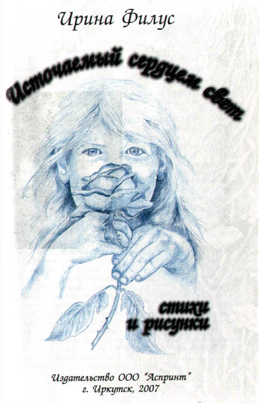 Ирина Филус. Источаемый сердцем свет. Издательство ООО "Аспринт", Иркутск, 2007. Сбрник стихотворений Ирины Филус, оформленный её рисунками. Ирина Филус родилась в Иркутске в 1953 году, окончила факультет охотоведения Иркутского сельскохозяйственного института, с 1978 года бессменно работала в Алтайском заповеднике. Читатели и зрители стихов и рисунков Ирины Филус откроют для себя этот тонкий серебряный мир её искусства, который стал таким необыкновенным и значительным продолжением её жизни. Читать PDF (16 МБ).