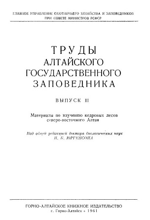 "Труды Алтайского государственного заповедника. Выпуск 3. Материал по изучению кедровых лесов северо-восточного Алтая". Под общей редакцией доктора биологических наук П.Б. Юргенсона. Издание было выпущено Горно-Алтайским книжным издательством в 1961 году тиражом 1000 экземпляров. В сборнике большинство статей посвящено изучению состояния кедровых лесов северо-восточного Алтая, путей их рационального использования и восстановления. Основные исследования проведены в 1959-1961 гг научными сотрудниками и лесничими Алтайского государственного заповедника. Читать PDF (9,16 МБ)