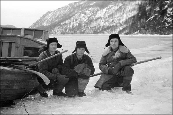Ещё до этого, в декабре в сильные морозы лёд накрывал озеро от Артыбаша до мыса Ажи. Как раз посередине между Артыбашем и Яйлю. Моторка наша (мы её называли почему-то «поганка») курсировала только до кромки льда около мыса Ажи. Вот мы именно около этого места. Слева направо: «поганка», лесник Олег Чирсов, лесник Валентин Параев, моторист Илларион Зиновьев.