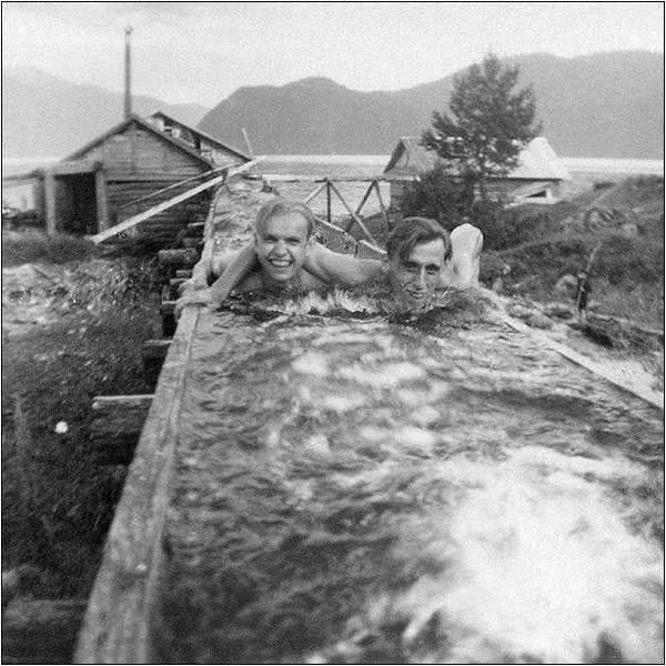 громный рубанок, готовить щепу из осиновых чурок. Это чтобы крыши дырявые ремонтировать. Часть воды шла в баню, которая видна на снимке справа. Кстати в жёлобе этом хорошо было купаться в жару. Чем мы и занимаемся с ботаником Иваном Коротковым (слева). А в ручье какой-то малолетний рыбачок стоит, хайрюзков ловит.