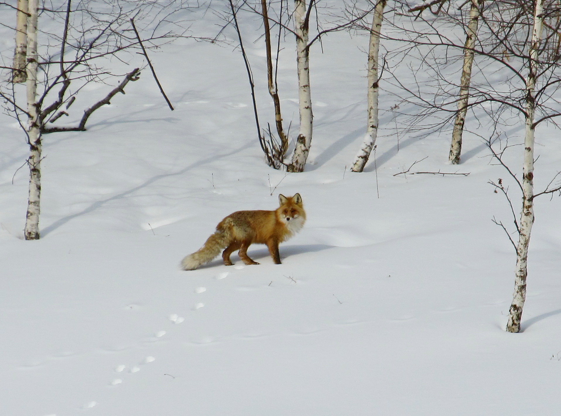То, что это та же лиса – нет сомнения, только она стала значительно крупнее и еще красивее в своей рыжей шубке. Она не пуглива, приходит даже днем, садится на пригорочке в 50 м от жилого дома и наблюдает за происходящим на кордоне, может поспать под сваленным деревом, изредка поднимая голову и прислушиваясь к окружающим звукам. Звуки с кордона доносятся всевозможные – куры в сарае кудахчут, собака лает, телята в сарае топают копытцами. Но лиса не обращает на эти звуки особого внимания. Конечно, стоит только выйти кому-нибудь из жилого дома, лиса тут же старается скрыться, но не спеша, как будто знает, что никто ее не тронет, а только фото сделают на память. Но позировать лиса не очень любит, близко подойти к ней не удается, поэтому лишний раз стараемся ее не беспокоить. Наблюдаем лисичку в основном с окна и каждое утро ждем, когда же снова придет наша гостья.