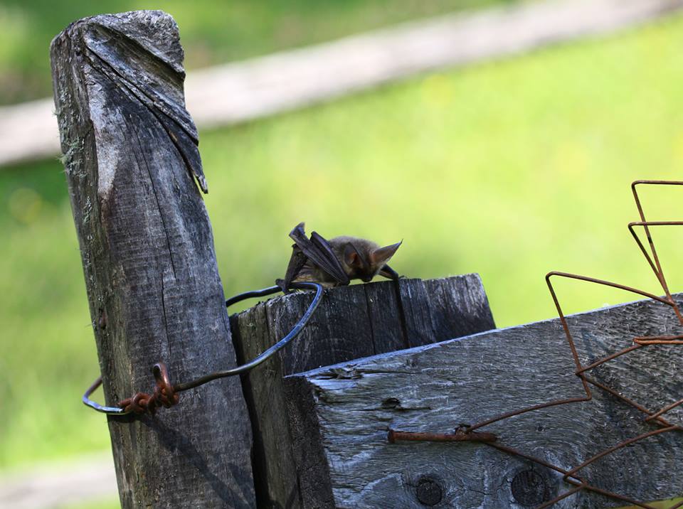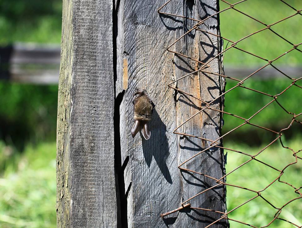 Я побыл какое-то время у калитки, и уже было собрался уходить, как вдруг опять появилась летучая мышь. Она прекрасно ориентировалась в радиусе более 100 метров даже днем! Мышка залетела в открытую дверь сарая, выпорхнула обратно, и села на то же самое место где я ее обнаружил. Летучая мышь все никак не могла устроиться на покой.
