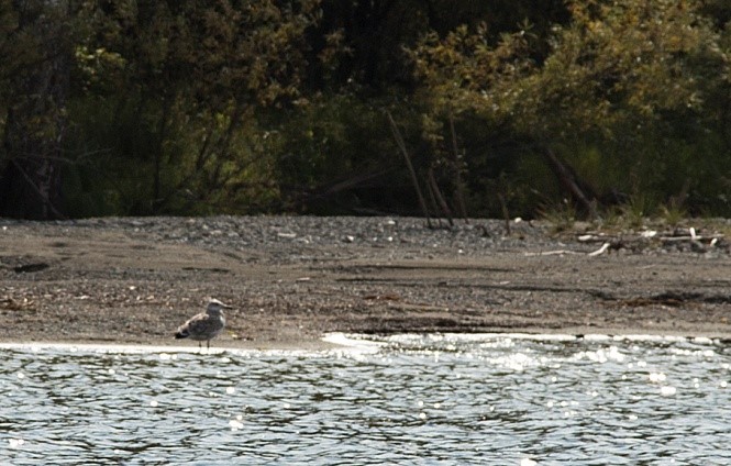 Но вот опять на горизонте тучи и надо торопиться дальше. Опять едем вдоль берега и наблюдаем. Иногда перед самой лодкой взлетают утки, но непуганые птицы, пролетев немного, тут же опять садятся на воду. На берегу видим чайку, одиноко гуляющую вдоль кромки воды.