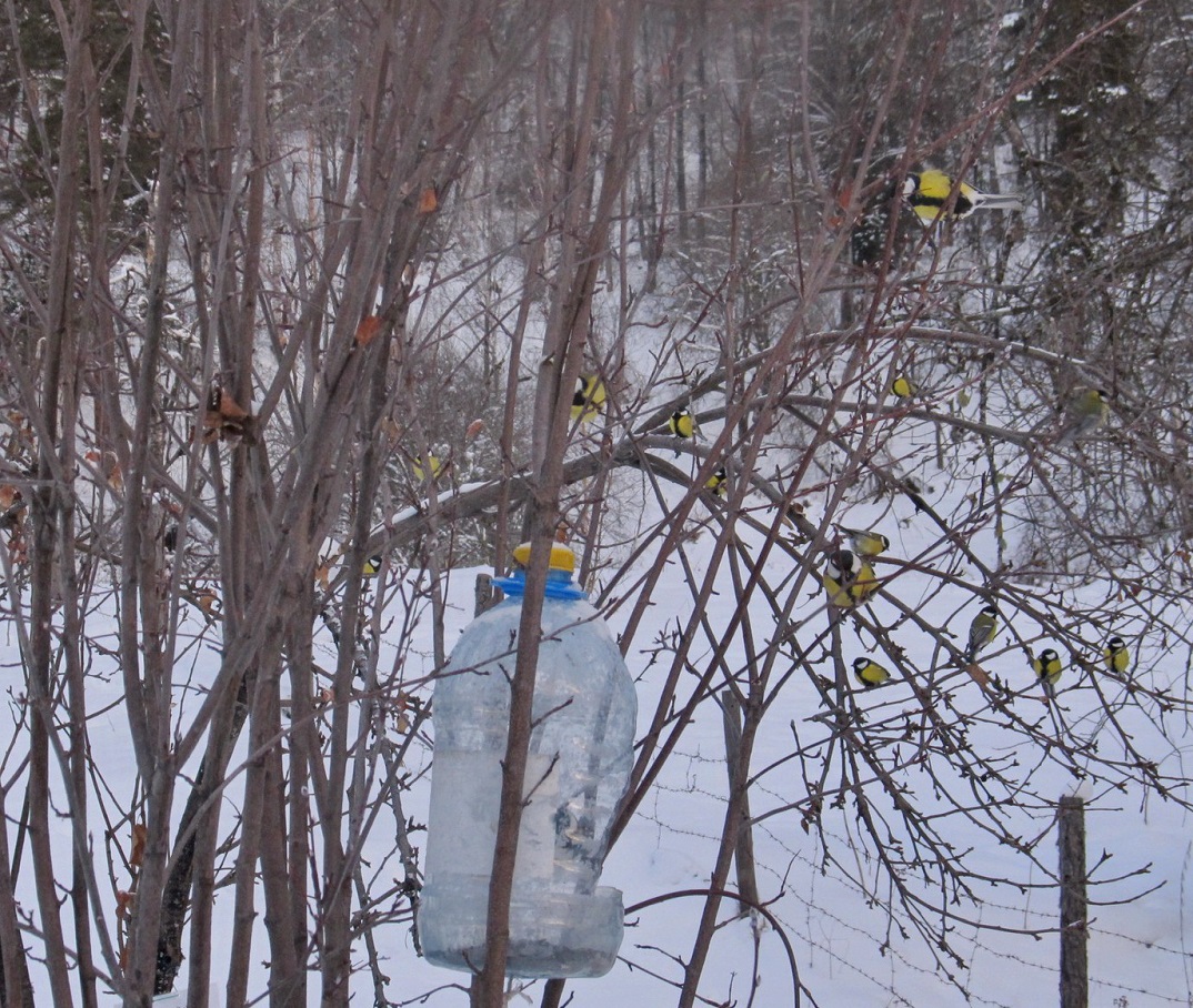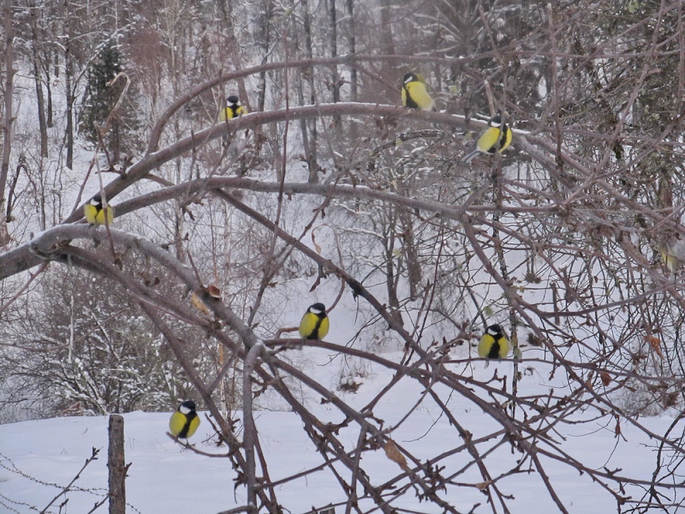 В предыдущие годы к кормушке прилетали снегири, надеемся их увидеть и в этом году. Очень интересно наблюдать за поведением птиц, прилетающих к кормушке. С утра, пока еды еще в кормушке нет, птички, особенно синицы, проверяют на кордоне все уголки - сарай, дровяник, залетают в открытую дверь веранды, заглядывают в окна и с нетерпением ждут корма. Затем, когда в кормушку насыпана еда, как по команде, словно прозвучал гонг – все слетаются к кормушке. Подлетают к кормушке всегда по одной, берут в клюв одно семечко и улетают (этот процесс происходит так быстро, что бывает трудно подсчитать общее количество птиц, прилетающих к кормушке) в безопасное место. Такие безопасные места могут быть везде в пределах 5-10 метров. Шелуху от семечек можно увидеть под деревьями, растущими поодаль, в сарае, в теплице, поэтому весной всходы подсолнечника можно встретить в самых неожиданных местах.
