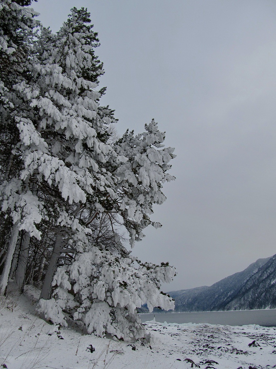 Во время обхода в окрестностях кордона Байгазан, можно было увидеть завораживающую картину – в прибрежной части озера деревья покрыты толстым слоем изморози. Кажется, что деревья укрылись от мороза мохнатыми шубами, под тяжестью намёрзшего инея ветки низко склонились до земли, стойко выдерживая натиск холодного ветра.