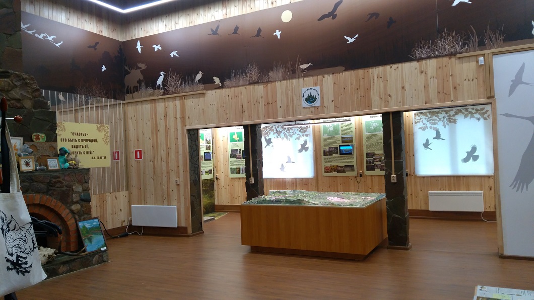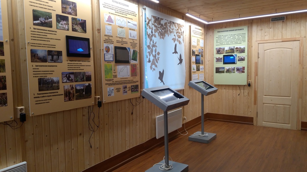 В музее представлены чучела кабана, лисицы, волка, молодого медведя, лося и множество пернатых обитателей здешних мест, ну и, конечно, насекомые. Также в музее имеются спилы различных видов деревьев разных возрастов. Процесс формирования болот хорошо показывает макет.