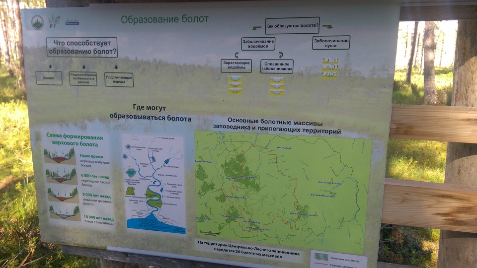 Общая протяженность экологической тропы составляет 4,4 км, на время прохождения маршрута ушло порядка 4-х часов. Минаева Татьяна Юрьевна рассказала об истории формирования болотного комплекса, специфике растительных сообществ болот и познакомила нас с историей и этнографией последней, исчезнувшей с территории заповедника деревни, дала характеристику флоры и фауны различных биоценозов, характерных для южной тайги.