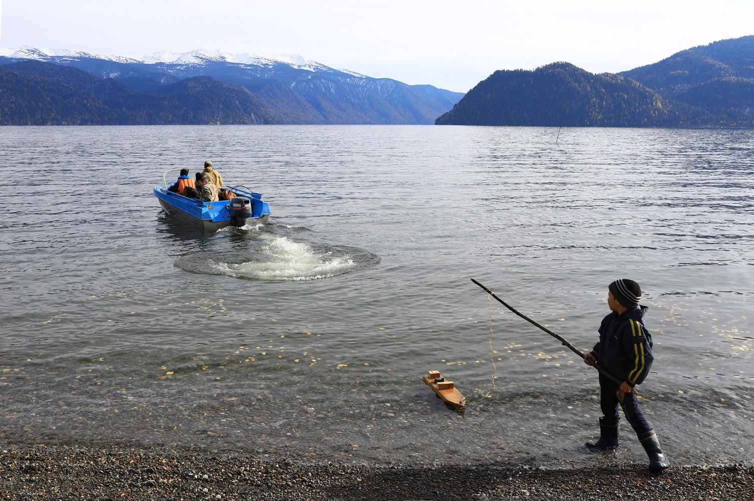 Перед восхождением на заснеженный хребет ещё предстоит преодолеть больше 10 километров неспокойного в это время года Телецкого озера. Фото А. Лотова.