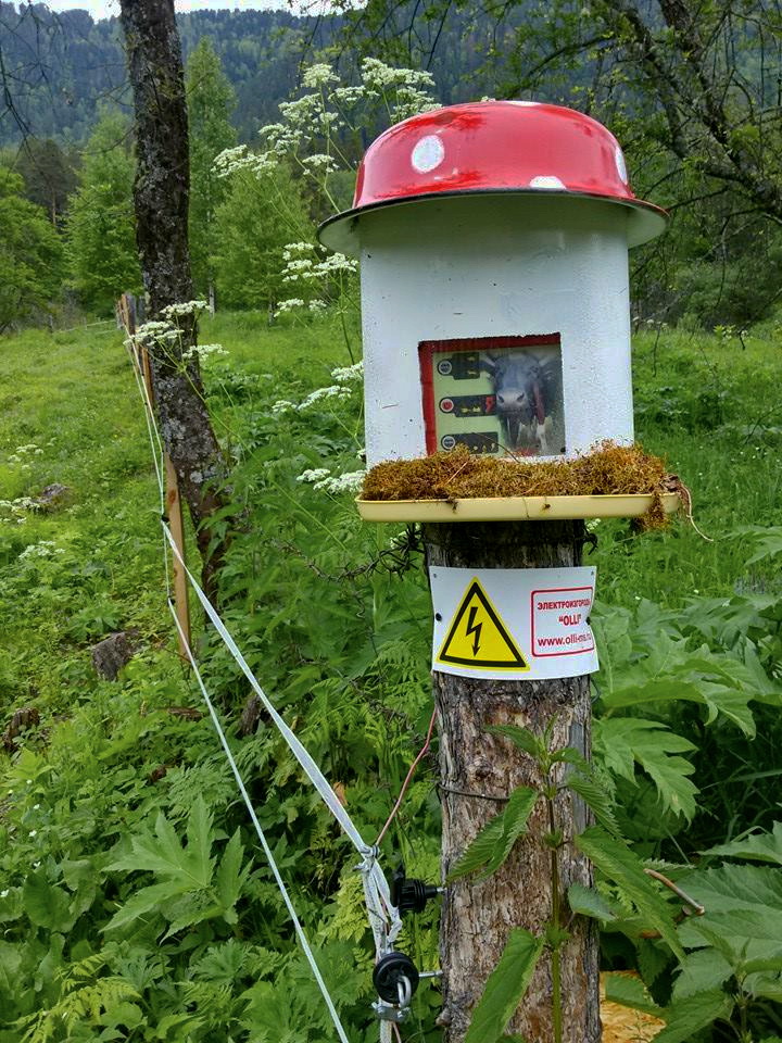 Вот так обозначена электроизгородь, установленная на кордоне. Всех гостей обязательно предупреждают - электроизгородь действующая, не трогаем ничего :)