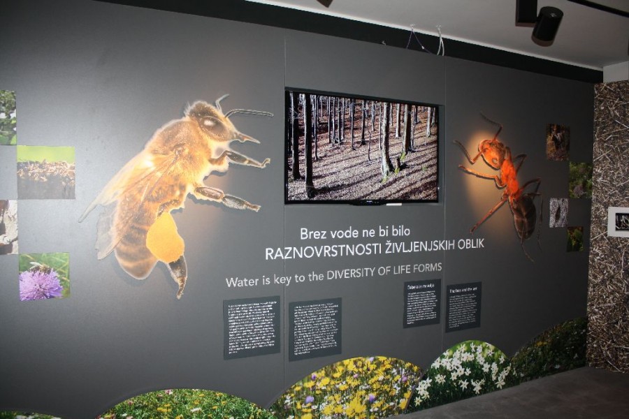 Стенд и ЖК-панель с фильмами, посвященная роли пчел и муравьев в экосистеме.