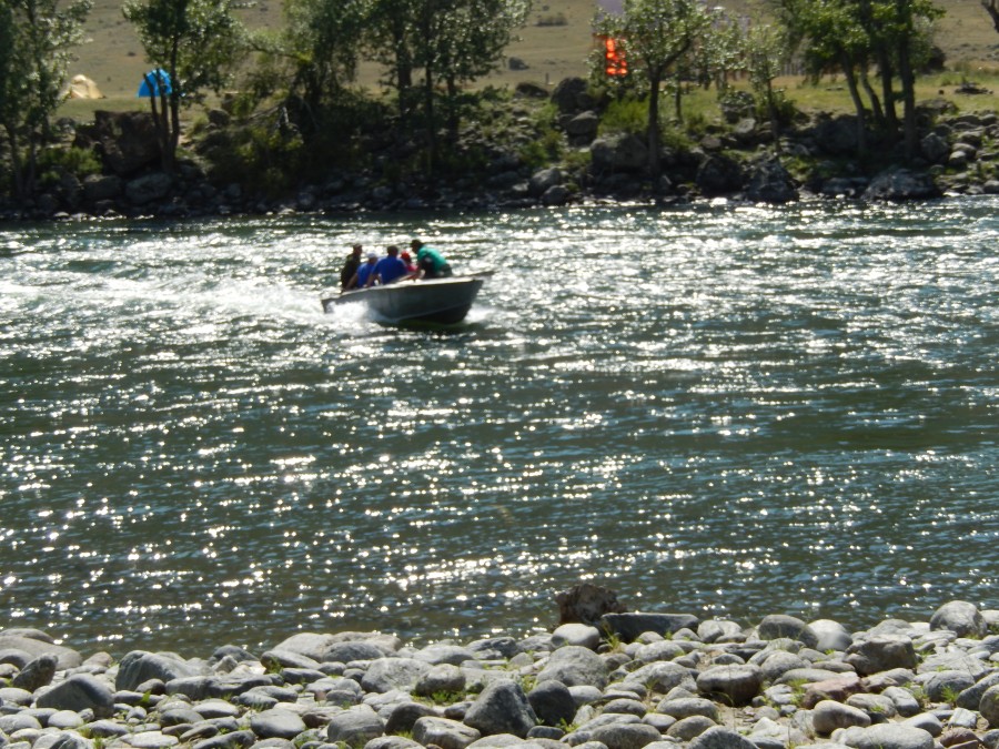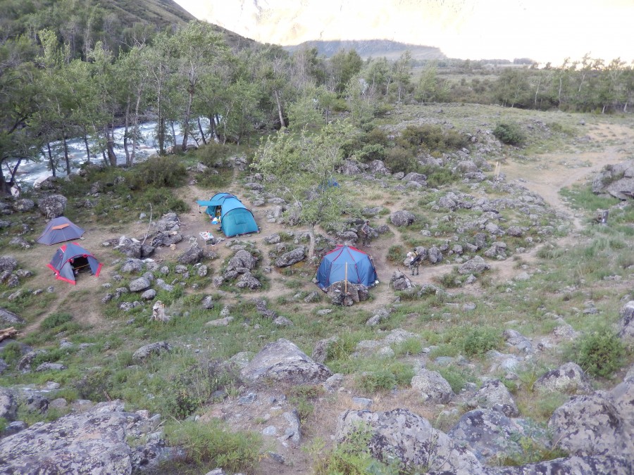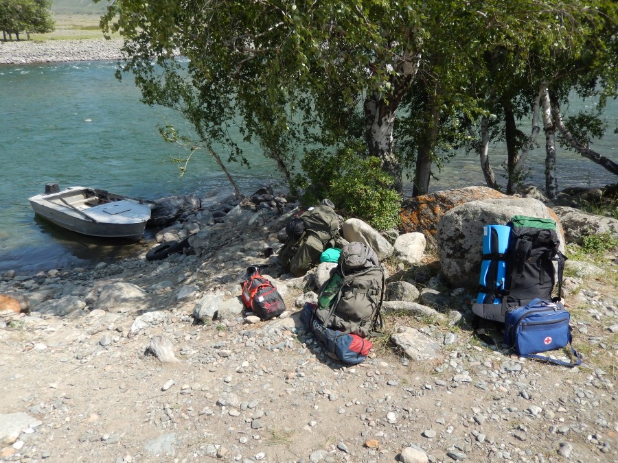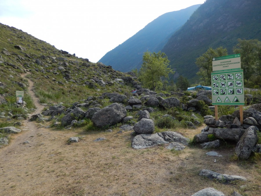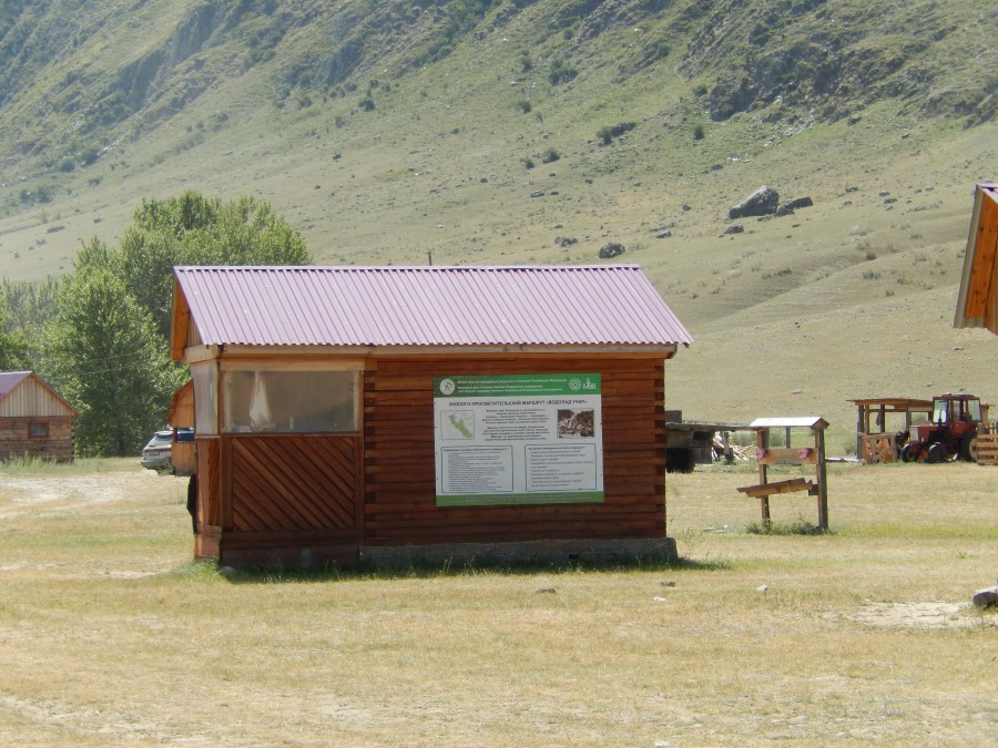 Доехали до турбазы "Красный камень". Здесь мы оставляем автомобили. Дальше - переправа через Чулышман, а потом пешком. На одном из домиков турбазы красуется наш баннер с информацией об эколого-просветительском маршруте "Водопад Учар".