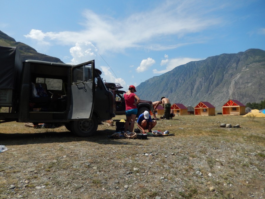 Перебираем вещи, оставляя ненужное в машинах. Нести на себе лишний груз совсем не хочется. Девочки готовят обед.