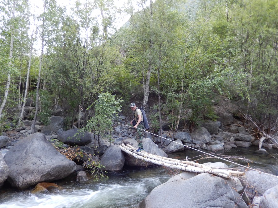 Переправа через речку Артышту. На мостике - госинспектор Эжер Суразов, он-то и возводил эту переправу в начале сезона. Строить здесь что-то более капитальное не имеет смысла - весной и без того бурная речка приобретает совершенно неукротимый характер и сносит все на своем пути.