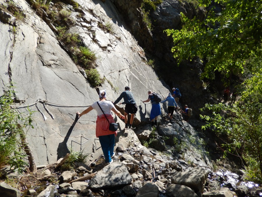 До недавнего времени этот короткий участок пути был труднопроходимым. Летом 2014 года скальная полка была снабжена системой крепежей для веревок и скоб-упоров для ног. Ходить тут стало одно удовольствие. Правда в начале сезона 2015 года обнаружилась пропажа нескольких проушин-крепежей для веревок. Пропавшие детали были заменены и, как мы видим сейчас - веревки и скобы очень помогают желающим добраться до водопада.