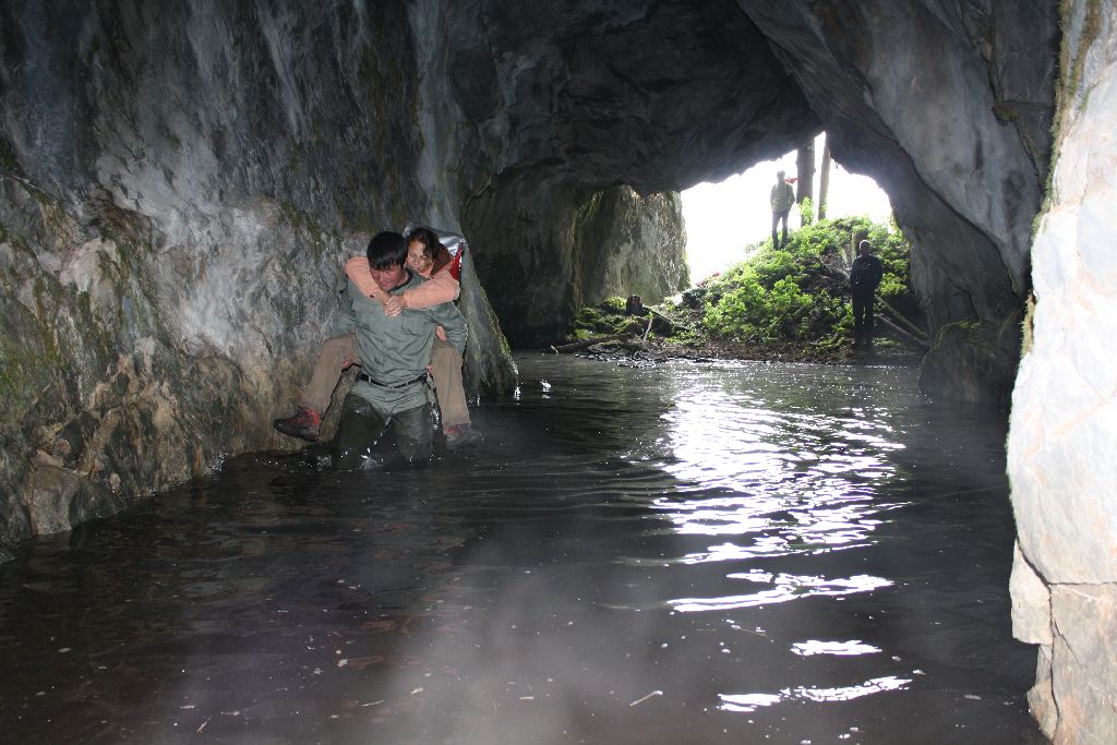 И тут наша экспедиция была как никогда близка к провалу – микробиолог Таня Пипан не обладая непромокаемым костюмом, не видела никаких вариантов пересечения этой чертовой лужи. Ситуацию спас госинспектор заповедника Василий Князев, предусмотрительно экипированный в сапоги-болотники.