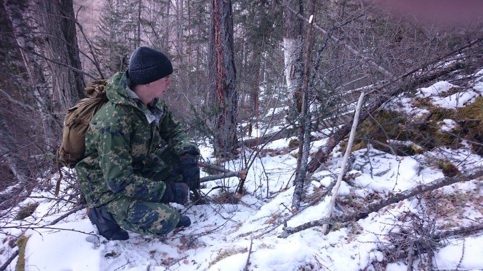 Первый радиальный выход и нашли путик. Евгений Ракин у браконьерской петли
