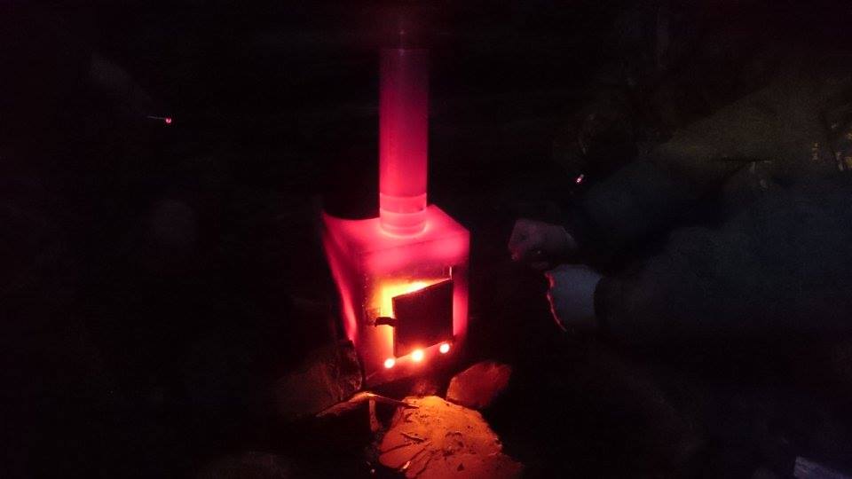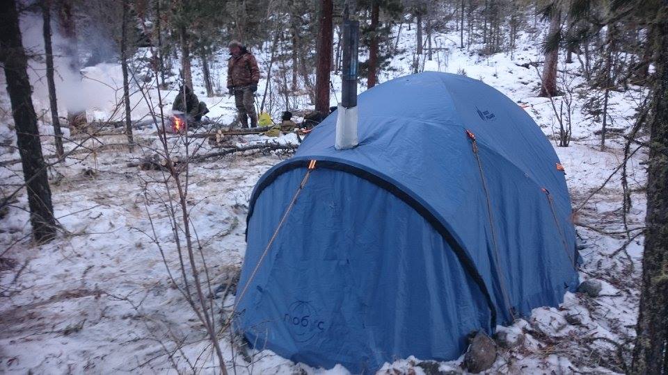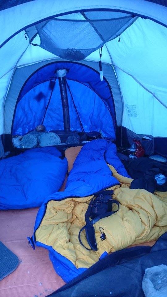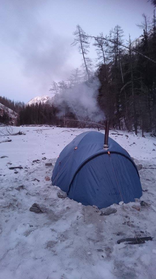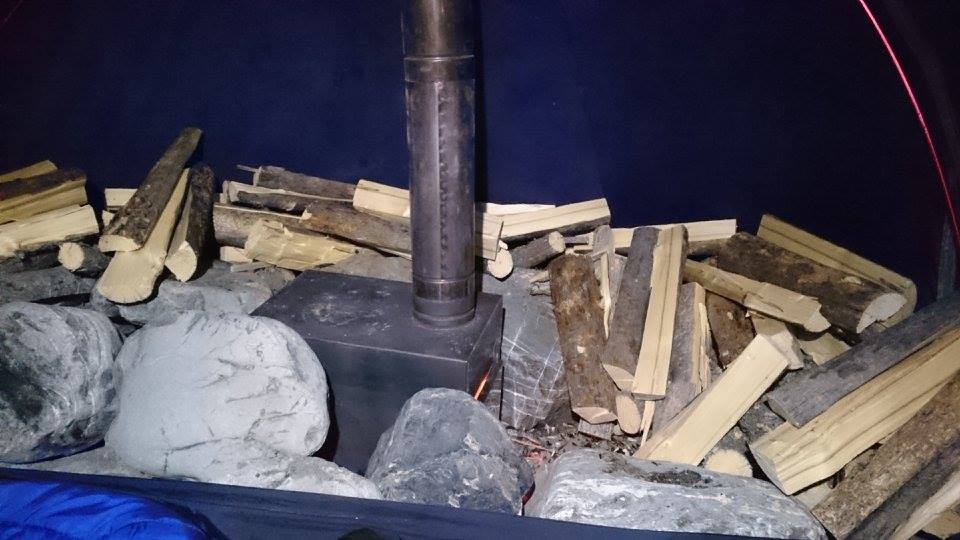 На улице мороз, а в нашей палатке тепло и даже жарко! Печку обложили камнями. Как-никак тепловой аккумулятор и одновременно изолятор стенок палатки от нашей термоядерной печки! Такой подход сглаживает синусоиду колебания температуры внутри палатки при работе печи.