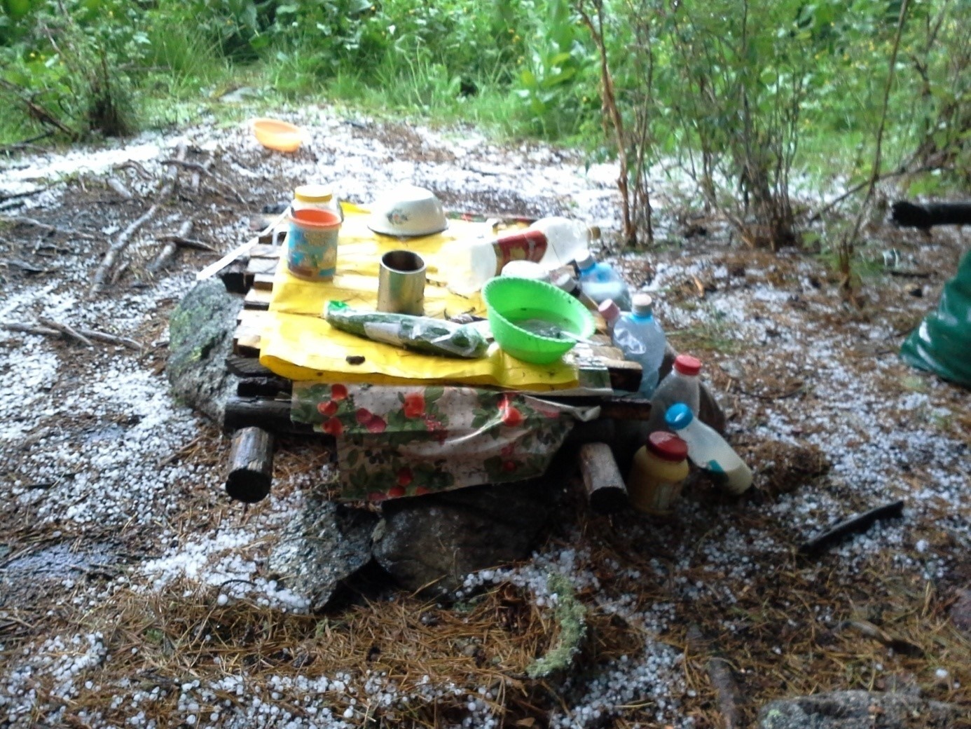 Мы все посмеялись. И тут что-то падает на наш походный столик. Это была градинка размером с перепелиное яйцо. У нас начался смех, который было невозможно остановить. Действительно, было слишком неожиданно все это, поэтому вдвойне смешно.