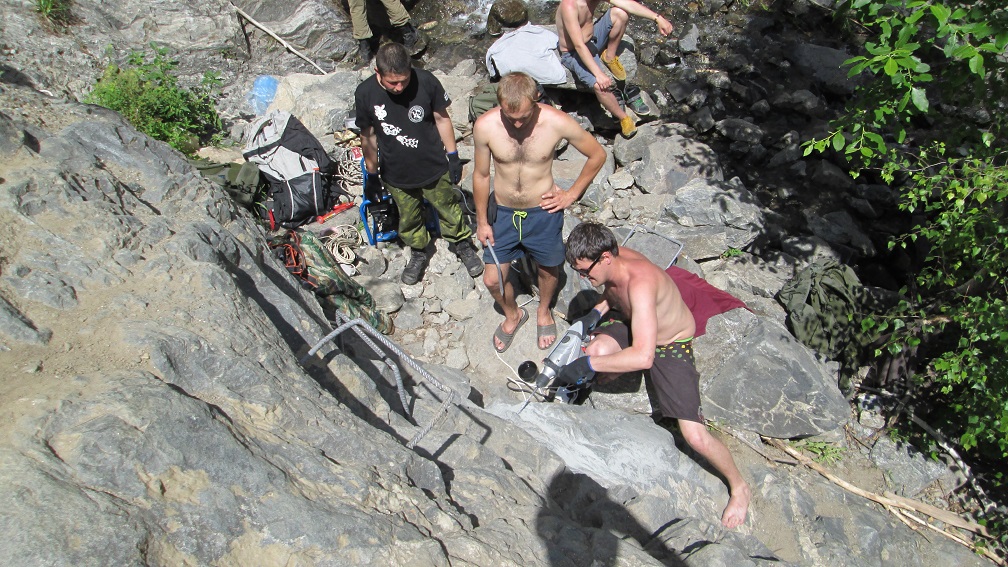 Добрались до места. С удивлением обнаружили пропажу нескольких рым-гаек, которые установили на скале в прошлом году. Сквозь них продевается веревка, для облегчения прохождения опасного участка. Какой-то «умелец», видимо, располагая большим количеством времени и недюжинной силой вывернул гайки. Остается только догадываться зачем – от безделья, или в хозяйстве страшно нужная вещь?!