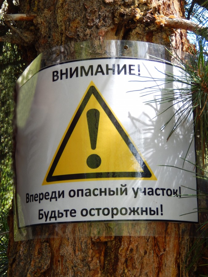 Двигаясь по тропе обратно развешала несколько предупредительных знаков рядом с тропой - о недопустимости разведения костров, об опасных участках и о том что где-то на маршруте притаилась в кустах фотоловушка, срабатывающая на движение.